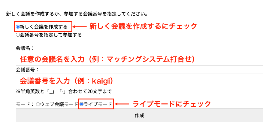 オンラインでの話し合いを始めるときは、まず「新しく会議を作成する」にチェックを入れます。 次に、分かりやすい「会議名」と、合言葉になる「会議番号(例:kaigi)」を自由に決めて入力してください。この会議番号は、プライベートメッセージなどで事前に参加メンバーに伝えてください。