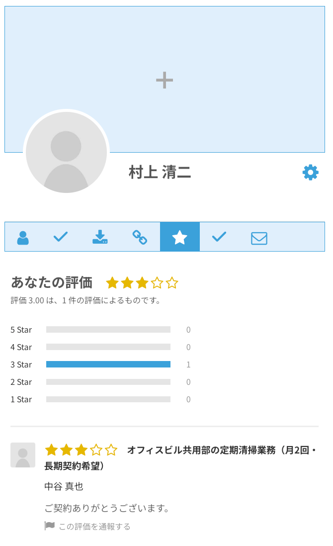 これまでに受け取った会員レビューを一覧でチェックできます。 評価の平均スコアはプロフィールにも表示されるので、あなたの実績が一目で伝わります。